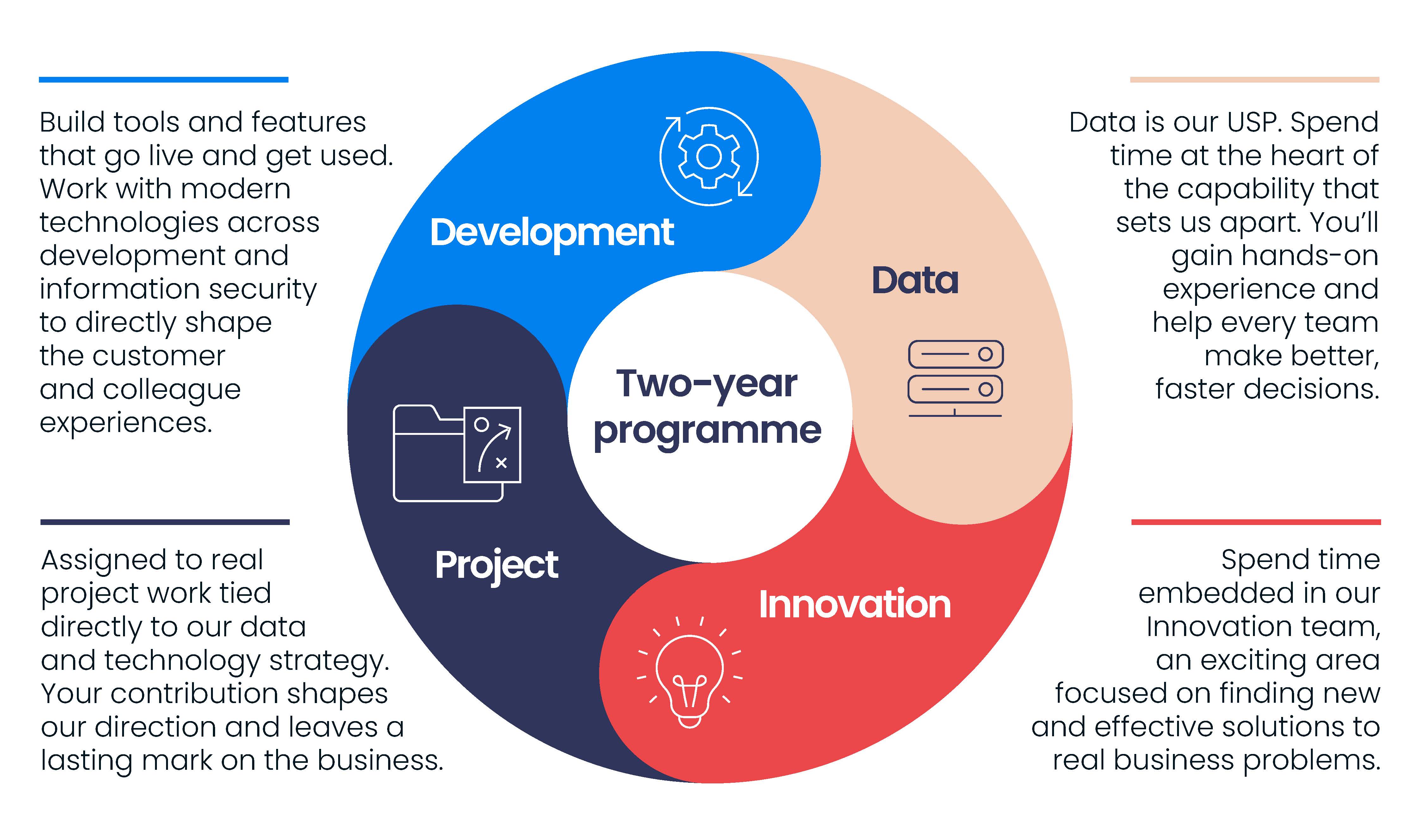 From October 2026 to September 2028, you'll complete three six-month rotations. These will include time spent in the development, innovation and data parts of our business. Your last six months will be working on a project tied directly to our data and technology strategy.
